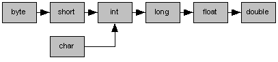 Jede Konvertierung, die in Pfeilrichtung erfolgt, beschreibt eine erweiternde Konvertierung, und jede Konvertierung, die entgegen der Pfeilrichtung erfolgt, beschreibt eine einschränkende Konvertierung. Andere Konvertierungen zwischen primitiven Datentypen sind nicht erlaubt. Insbesondere gibt es also keine legale Konvertierung von und nach boolean und auch keine Konvertierung zwischen primitiven Typen und Referenztypen.
