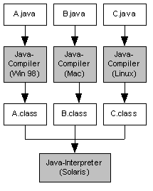 Wie die Abbildungen deutlich machen, spielen die .class-Files für den Entwicklungsprozeß und die Portierbarkeit von Java-Programmen eine entscheidende Rolle. Jede .class-Datei enthält den Bytecode für eine übersetzte Klasse. Zusätzlich sind in ihr Informationen enthalten, um dynamisches Linken und Late-Bindung zu unterstützen und gegebenenfalls Symbole, Zeilennummern und andere Informationen für den Debugger zur Verfügung zu stellen.