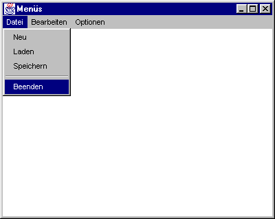 Das folgende Programm stellt alle bisher erwähnten Eigenschaften in einem Beispiel dar. Es leitet dazu die Klasse MainMenu1 aus MenuBar ab und erzeugt im Konstruktor die Menüs und Menüeinträge. Gegenüber der einfachen Instanzierung von MenuBar bietet die Ableitung den Vorteil, daß die neue Klasse Methoden zur Verfügung stellen kann, die zum Zugriff auf Menüs oder Menüeinträge verwendet werden können.