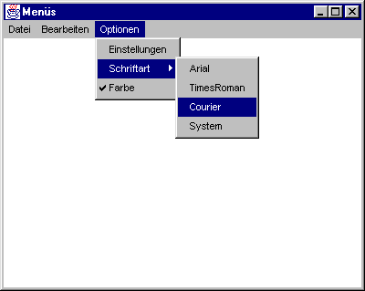 Menüs lassen sich auf einfache Art und Weise schachteln. Dazu ist beim Aufruf der add-Methode anstelle einer Instanz der Klasse MenuItem ein Objekt der Klasse Menu zu übergeben, das das gewünschte Untermenü repräsentiert. Das folgende Beispiel erweitert das Menü »Optionen« der Klasse MainMenu1 um den Menüeintrag »Schriftart«, der auf ein Untermenü mit den verfügbaren Schriftarten verzweigt (der Code zur Erzeugung des Untermenüs steht in den Zeilen 034 bis 041):