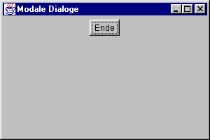 Das folgende Beispiel demonstriert die Anwendung der Klasse Dialog. Es zeigt einen Frame, aus dem per Buttonklick ein modaler Dialog aufgerufen werden kann. Der Dialog fragt den Anwender, ob die Anwendung beendet werden soll, und wartet, bis einer der Buttons »Ja« oder »Nein« gedrückt wurde. In diesem Fall wird ein boolescher Rückgabewert generiert, der nach dem Schließen des Dialogs an das Vaterfenster zurückgegeben wird. Falls der Rückgabewert true (entprechend dem Button »Ja«) ist, wird die Anwendung beendet, andernfalls läuft sie weiter: