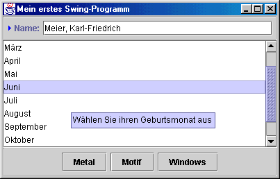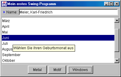 Oben links ist das Label "Name" mit seinem zugeordeten Icon zu erkennen. In das Textfeld wurde bereits der String "Meier, Karl-Friedrich" eingetragen. In der Liste ist der Monat Juni ausgewählt, und ihre Tooltips werden angezeigt, weil der Mauszeiger über der Liste verweilt. Die beiden Panels haben eine zusätzliche Umrandung, die vom Programm explizit hinzugefügt wurde.