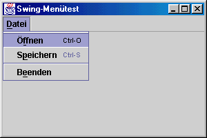Das folgende Programm zeigt eine Swing-Anwendung mit einem einfachen "Datei"-Menü, das die Einträge "Öffnen", "Speichern" und "Beenden" besitzt. Das Menü und seine Einträge besitzen mnemonische Kürzel, und die Menüpunkte "Öffnen" und "Speichern" sind über die Beschleuniger [STRG]+[O] bzw. [STRG]+[S] zu erreichen. Das Applikationsobjekt registriert sich als ActionListener bei allen Menüpunkten und gibt die Benutzeraktionen auf der Console aus. Das Programm erzeugt zunächst eine neue Menüleiste und fügt ihr in Zeile 016 das in createFileMenu erzeugte Menü hinzu. Schließlich wird die Menüleiste mit setJMenuBar an das Hauptfenster übergeben.
